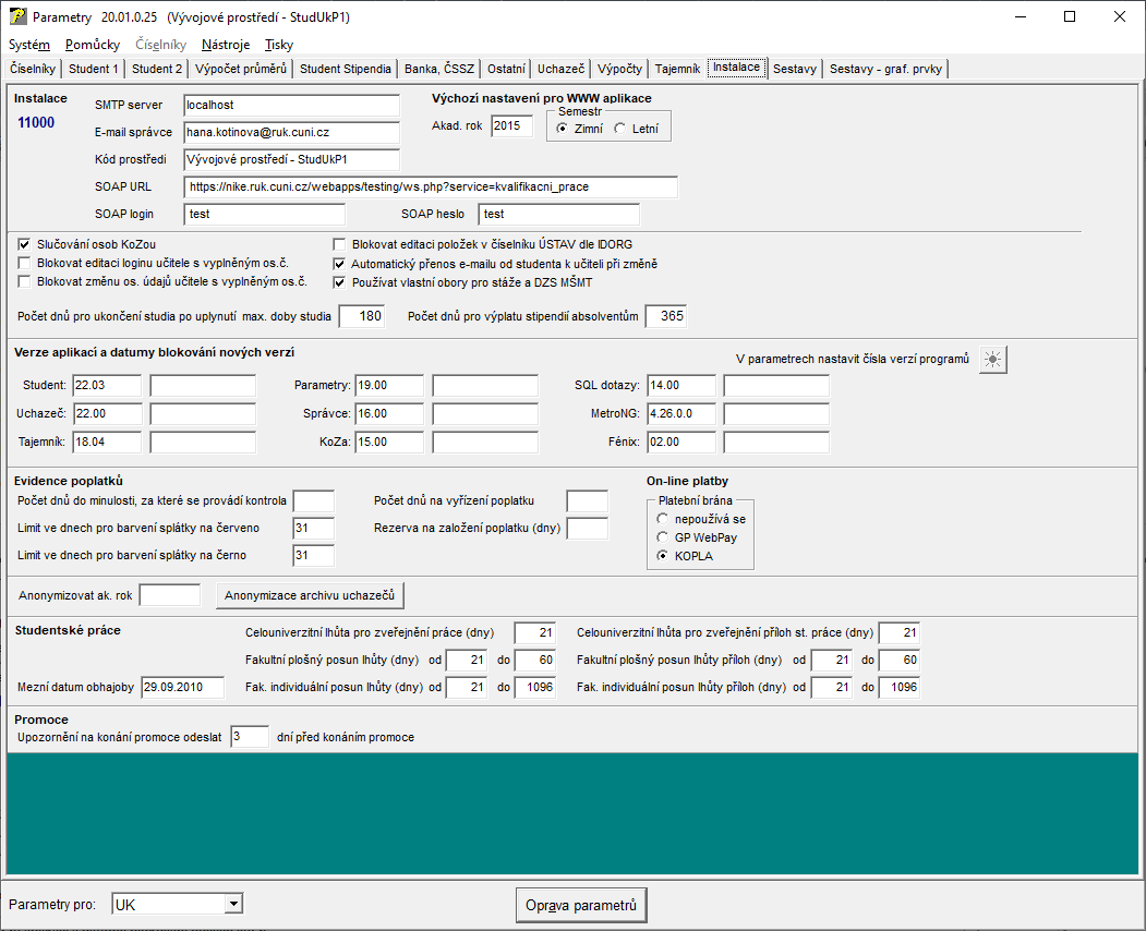 - Informace o aktuální verzi programu Student, Uchazeč, Tajemník, Parametry, KoZa, Správce, Bobr, Metro a SQL dotazy. Verze je možné ručně upravovat, lze nastavit požadovanou minimální spustitelnou verzi programu, aby se např. zablokovala verze, pro kterou nejsou provedeny potřebné změny v databázi apod.