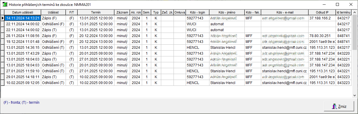 - Jedná-li se o kombinovanou zkoušku, je v nadpisu okna za kódem zkoušky text v závorce "(KZ)", např. "Historie přihlášených termínů ke zkoušce: HP0132 (KZ)".