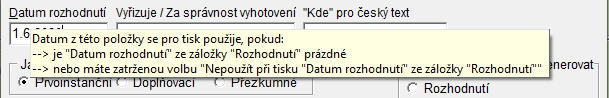 - Zaškrtnutím možnosti "Nepoužít při tisku "Datum rozhodnutí" ze záložky "Rozhodnutí"" (v popisu se zobrazuje i hodnota této zmiňované položky ze záložky "Rozhodnutí", pokud je vyplněna) se nastaví, že se toto datum rozhodnutí z přihlášky bude ignorovat