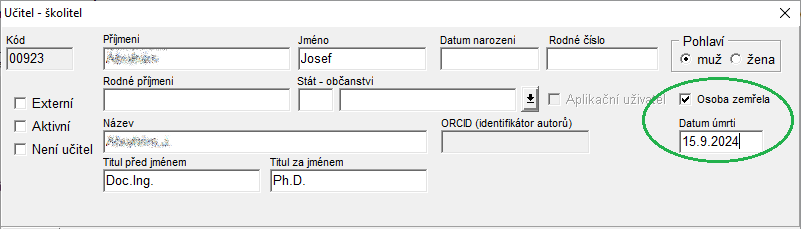 Číselník učitelů a zaměstnanců obsahuje případně informaci, že daná osoba zemřela. Zesnulé osoby mají v editačním okně "Učitel - školitel" v pravém horním rohu text "Osoba zemřela".