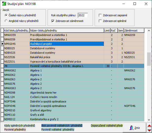 - Zobrazovat zapsané - předměty, které má student závazně zapsané jsou podbarveny světlejším odstínem příslušné barvy
