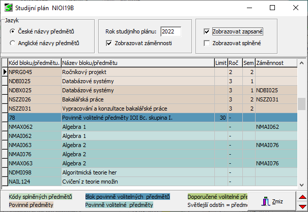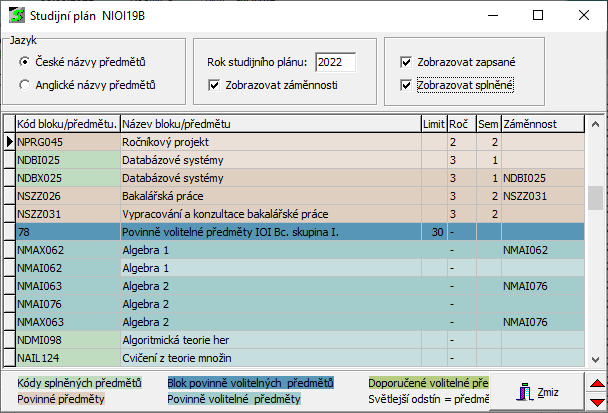 - Zobrazovat splněné - předměty, které má student splněné jsou ve sloupci "Kód předmětu" podbarveny barvou pro označeni předmětů splněných celkem