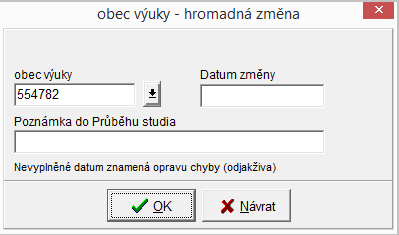 Po výběru z menu se zobrazí okno, ve kterém je třeba výběrem z číselníku zvolit novou obec výuky. Je také možné zadat datum, od kdy platí změna, případně "Poznámku do Průběhu studia". Po stisku tlačítka "OK" program prochází jednoho studenta po druhém. U každého zkontroluje, zda má stejnou fakultu, druh a formu studia a obor jako první měněný student. Pokud tomu tak není, výpočet se ukončí (u předchozích studentů, kde výpočet správně proběhl, se provedená změna uloží).