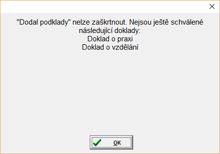 - V editaci přihlášky, při zaškrtnutí položky "Dodal podklady" na záložce Škola program zkontroluje, zda přihláška obsahuje všechny povinné přílohy a zda jsou všechny tyto povinné přílohy schválené. Pokud ne, program vypíše názvy všech chybějících povinných neschválených příloh a nedovolí položku "Dodal podklady" zaškrtnout.
