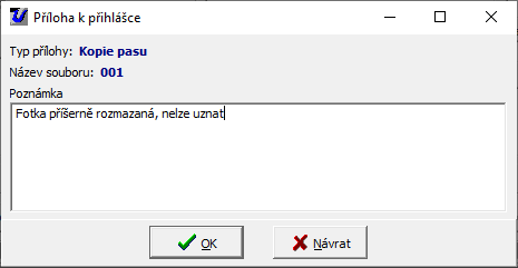Poznámka - ke každé příloze k přihlášce lze zadat/upravit poznámku pomocí tlačítka "Poznámka".