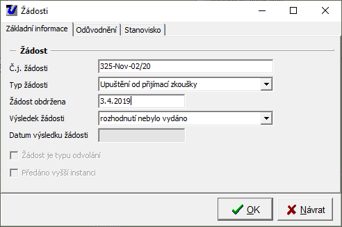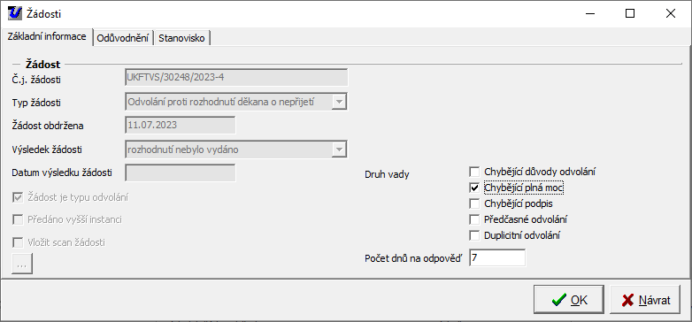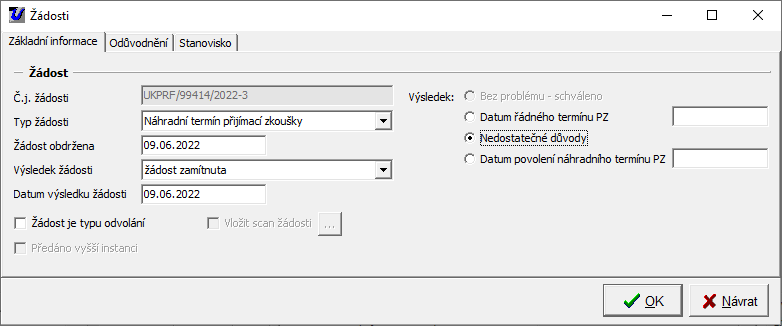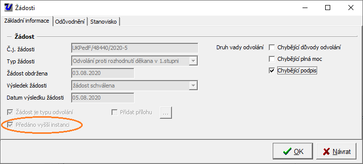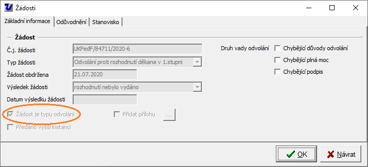 V případě podání odvolání proti nepřijetí ke studiu, je po stažení žádosti "Odvolání proti rozhodnutí o přijetí" z nezpracované podatelny automaticky zaškrtnutý checkbox "Žádost je typu odvolání".