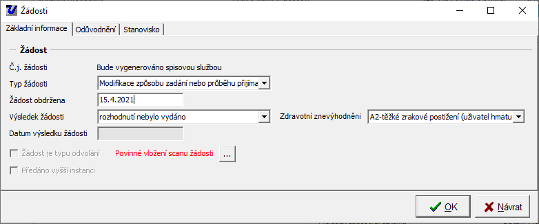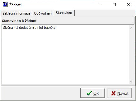 Na dalších záložkách se vyplňuje Odůvodnění k výsledku žádosti (povinné při schválení/zamítnutí žádosti) a Stanovisko (komentář) k žádosti - není povinná položka.