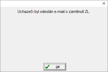 Při zamítnutí přílohy "Zápisový list" referentkou se uchazeči odešle informační e-mail o této skutečnosti. Po odeslání se zobrazí informace o úspěšném/neúspěšném odeslání e-mailu.