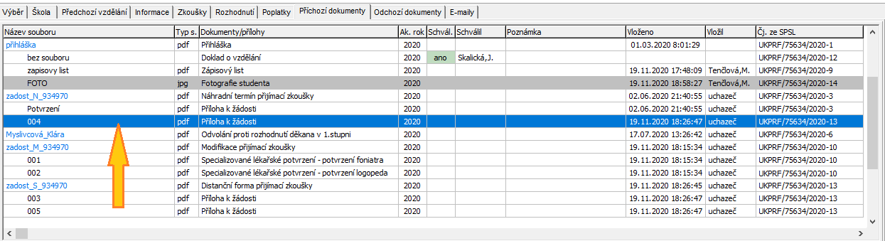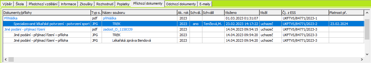 - pokud přílohu vložil sám uchazeč / student, místo jména se pro přehlednost zobrazí jen text "uchazeč" nebo "student".