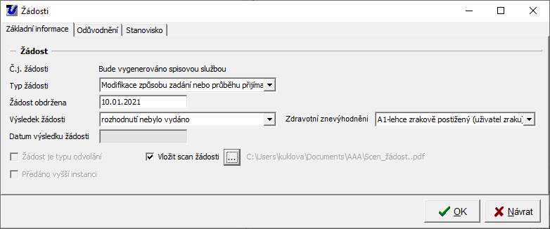 - při zapnutém parametru "Tisk čár.kódu a ČJ v pravém hor. rohu" (Parametry, záložka OSTATNÍ) se na PDF oskenované žádosti do pravého horního rohu vloží č.j. a čár.kód