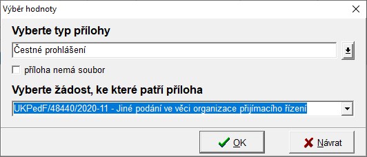 Nová příloha - založí se nová příloha. Po stisku tlačítka se otevře okno Výběr hodnoty, kde je třeba zvolit typ přílohy. Je možno případně zaškrtnout "Příloha nemá soubor". Pokud není zaškrtnuto, po výběru typu přílohy a stisku OK se otevře okno pro výběr přílohy-souboru. Po vybrání souboru a stisku tlač. Otevřít se vybraný soubor uloží k přihlášce jako příloha.