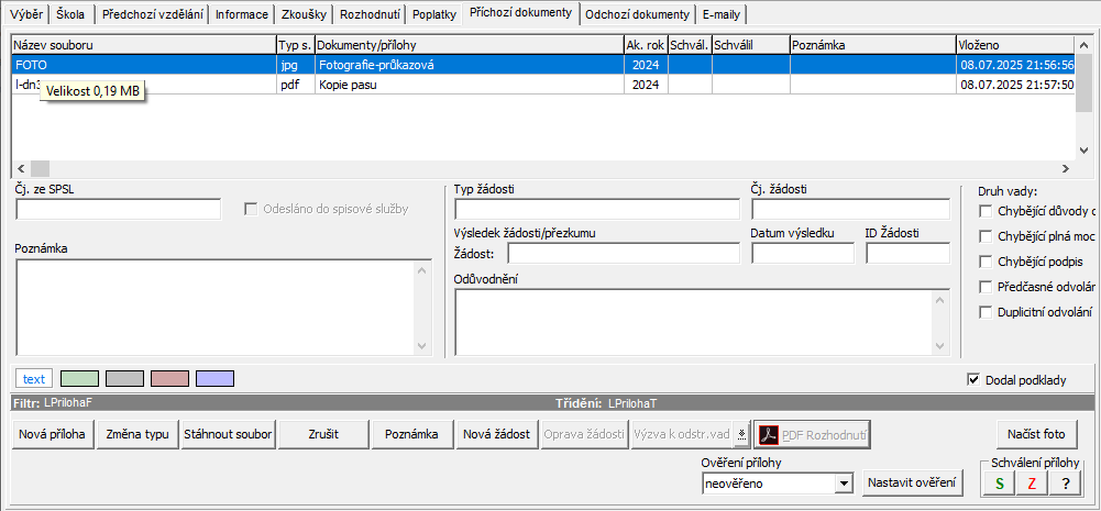 - pod seznamem příloh je přidáno nové tlačítko "Načíst foto". Pomocí tlačítka lze načíst označenou přílohu typu "FOTO" do osobních údajů uchazeče (tabulka OSFOTO)