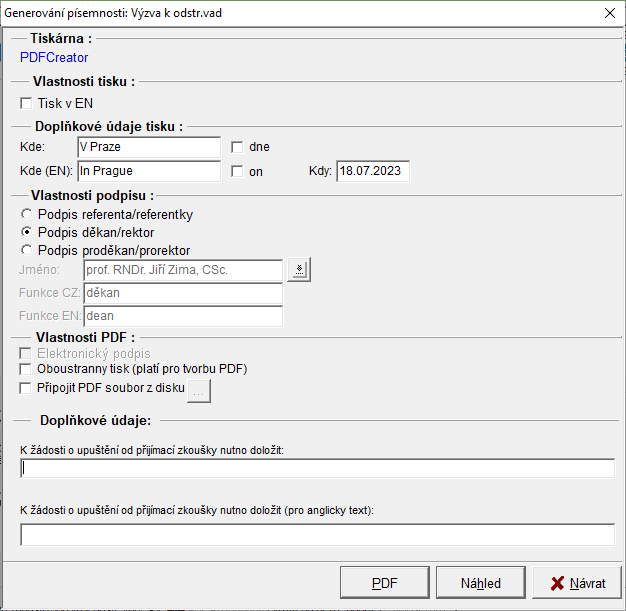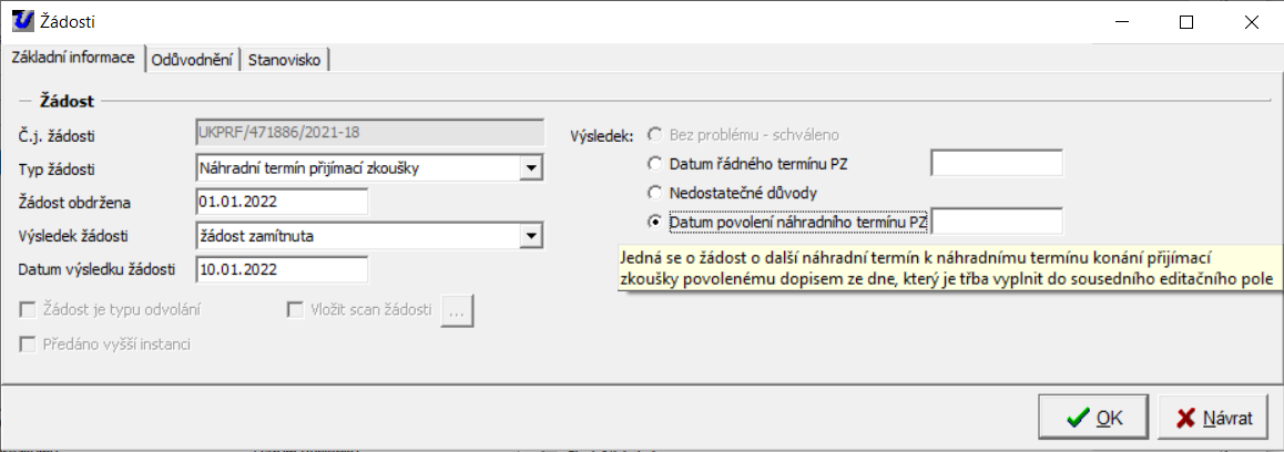 - u žádosti o náhradní termín přijímací zkoušky a žádosti o upuštění od přijímací zkoušky, se po schválení/zamítnutí žádosti zpřístupní tlačítko "PDF Rozhodnutí", kterým lze vygenerovat "ROZHNT - Rozhodnutí o náhr.termínu přijímací zkoušky"/"ROZHUP - Rozhodnutí o upuštění od přijímací zkoušky" (jen kladné rozhodnutí)