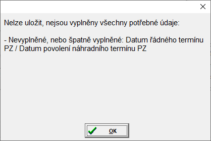 U volby "Datum řádného termínu PZ" či " Datum povolení náhradního termínu PZ" musí být vyplněné datum, program na tuto skutečnost upozorní hláškou: