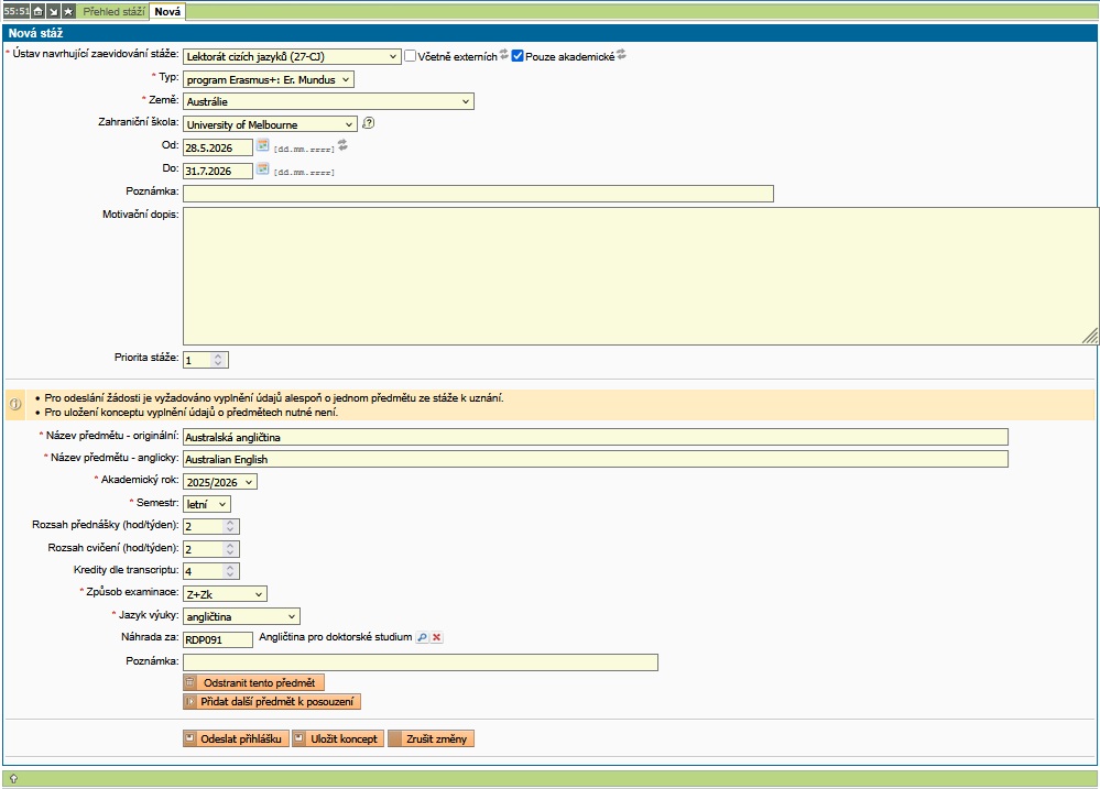 Evidence stáží » Nová žádost » Evidence předmětů ze stáže k uznání